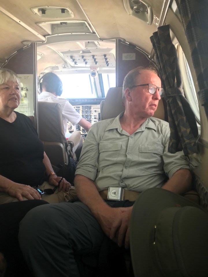 We are sitting in a very small plane. One passenger in the cockpit Troy and I on the left facing each other. Three side by side facing us and one behind me. We are on a short 1.5 hour flight. We land on an airstrip in the Bush. He said we may have to do fly bus if there are animals on The airstrip….