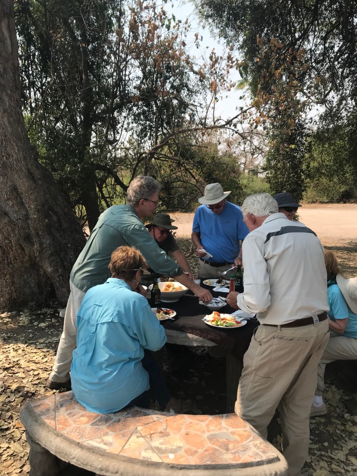 We stopped for a very nice lunch. At a picnic area in Chobe Park. Lots of meat. I cut up a pineapple to share. I’m not feeling the meat on this trip. So I eat salads and fruit mostly. Sometimes the cook good vegetables as well.