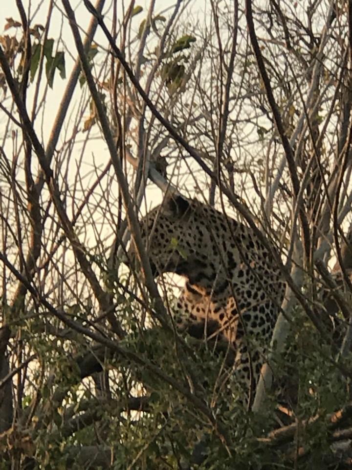 We followed them for awhile then went on. Shortly after the radio went nuts and we headed towards the commotion. Apparently a leopard took down an impala and the dogs took it away from him. The leopard was in the tree and the wild dogs were devouring the Impala. It was a feeding frenzy. So violent. We watched for a long time as they ripped it apart and ate it. The puppies were not there. They stay back with the alpha female. The other female eat and them come back and regurgitate the meat to feed the alpha female and the puppies.