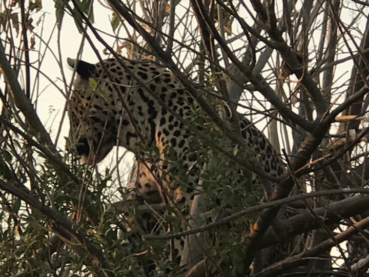 The leopard tried a few times to get out of the tree but the hogs kept chasing it back up. I was right by the tree rooting for the leopards safe escape. The guide said the dogs would kill the leopard if the got it. We left but later heard the leopard got away.
